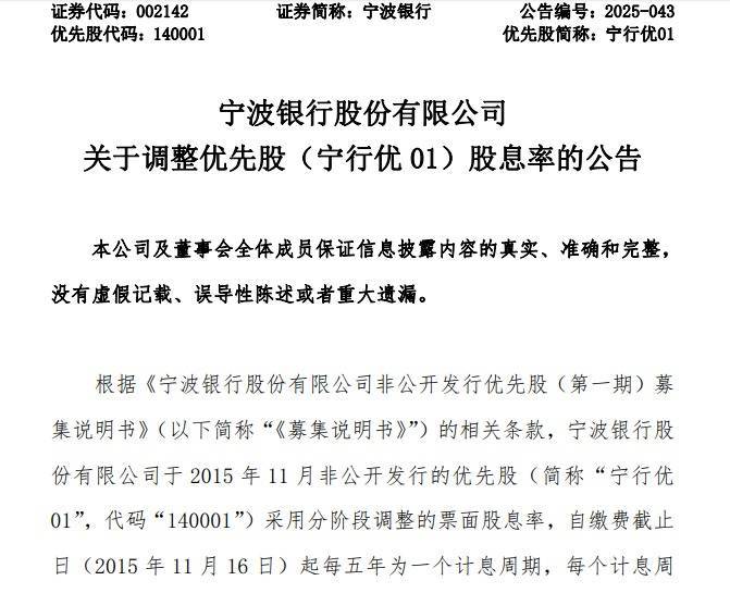 日前金股宝配资,宁波银行发布关于调整优先股(宁行优01)股息率的公告。